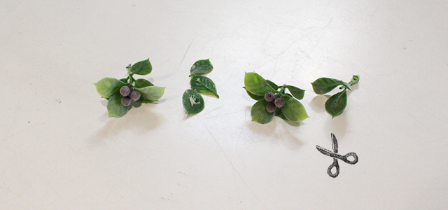 ベリーリーフを分けて下の方の葉や茎をカットして長さを調節します。