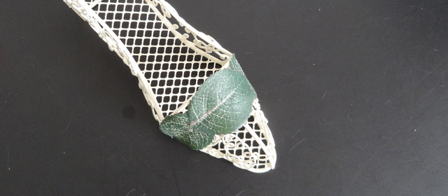 プチローズの葉を3枚カットしてハイヒールの花を貼る部分に3枚貼り付けます。